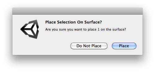if (transforms.Length > 0 && EditorUtility.DisplayDialog("Place Selection On Surface?", "Are you sure you want to place " + transforms.Length + " on the surface?", "Place", "Do Not Place", DialogOptOutDecisionType.ForThisMachine, placeOnSurfaceDialogDecisionKey)) { // Register and Undo event so that this action is not only not desctrutive but also easy to revert. // Without Undo, DialogOptOutDecisionType.ForThisSession would be a better fiting decision type. Undo.RecordObjects(transforms, "Place Selection On Surface"); foreach (Transform transform in transforms) { RaycastHit hit; if (Physics.Raycast(transform.position, -Vector3.up, out hit)) { transform.position = hit.point; Vector3 randomized = Random.onUnitSphere; randomized = new Vector3(randomized.x, 0F, randomized.z); transform.rotation = Quaternion.LookRotation(randomized, hit.normal); } } } } }