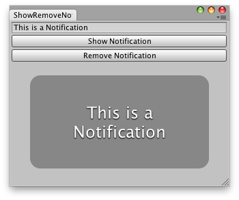 Displays notification message on the window. Unlike message boxes or log messages notification will fade out automatically after some time. Call RemoveNotification to remove it immediately.