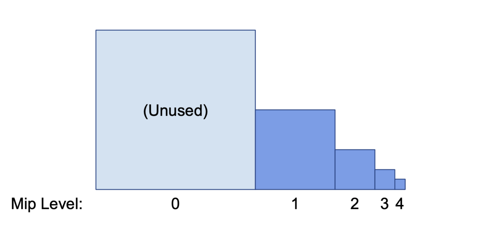 Mip levels of five textures. The first (unused) texture is set to 0 and increases by 1 mip level until the fifth texture which is set to 4. The size of each texture is a quarter of the texture preceding it.