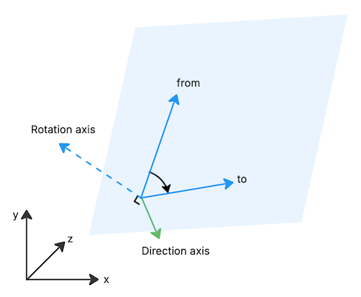 The from and to vectors lie in the blue plane. Both the rotation axis and the direction axis point above the rotation plane, so in this case the returned angle is positive.